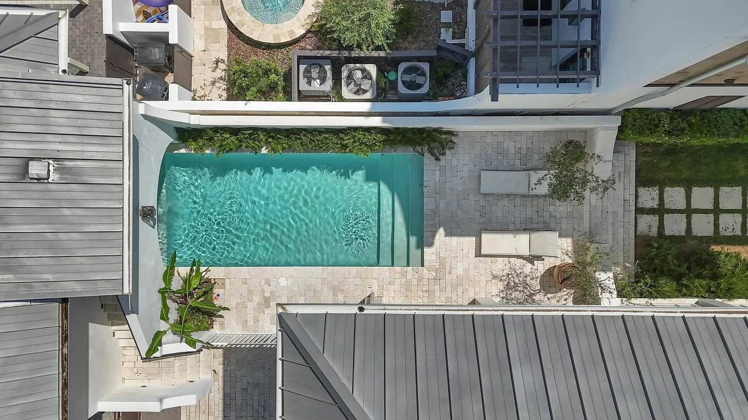 A central courtyard anchors the home, featuring a shaded porch, outdoor fireplace, pool, and an arched niche with a tiled fountain tucked beneath the stairway to the second-floor carriage house apartment. An outdoor kitchen and dining area encourage gathering, while a first-floor bar opens directly to the porch for seamless indoor-outdoor living. A small game table nearby allows puzzles and board games to stay set without interrupting mealtimes.