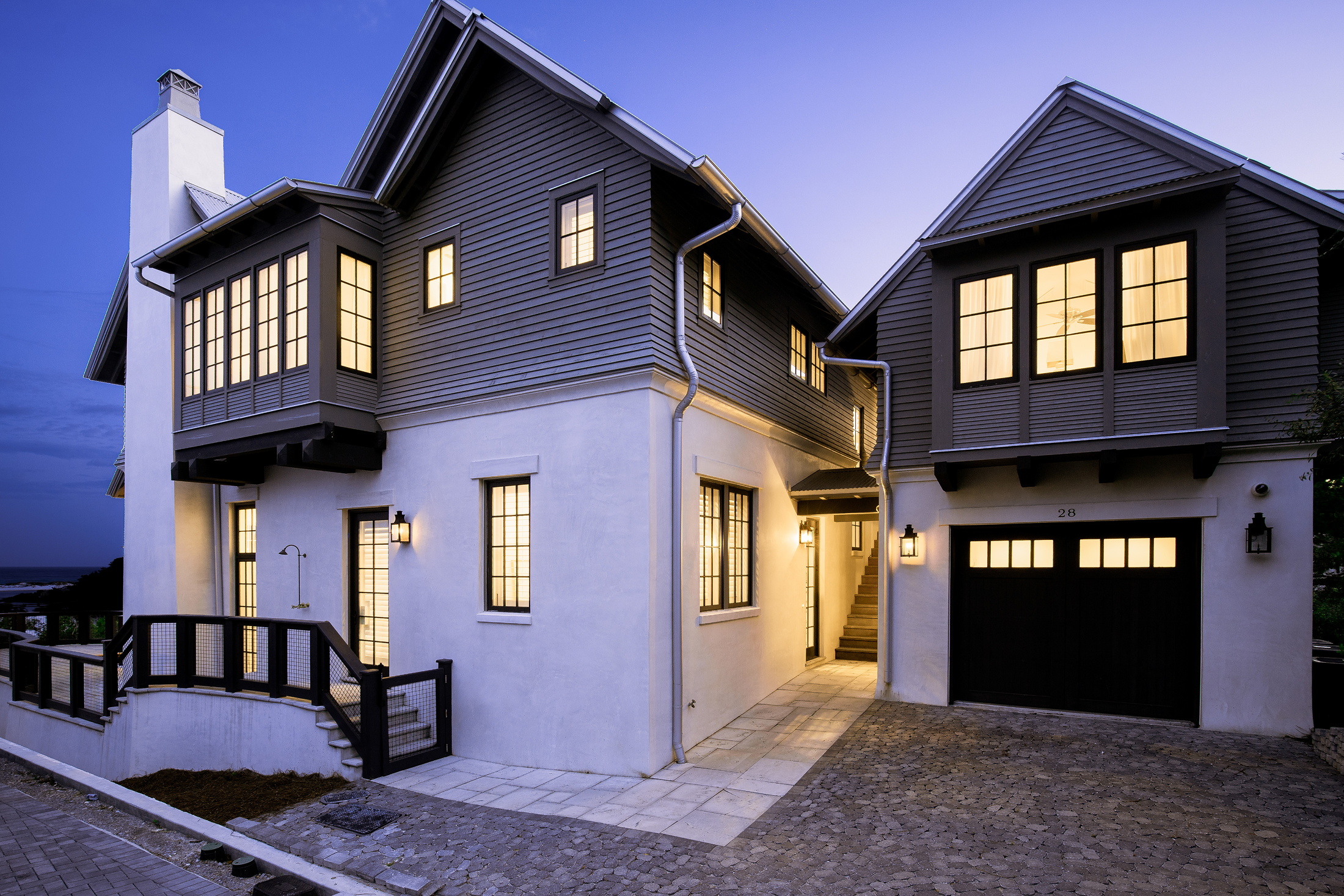 et within a wooded neighborhood that preserves mature trees and natural features, the architecture draws inspiration from the Adirondacks, expressed through deep porches and true cedar siding with rich thickness and profile that create strong shadow lines across the exterior.S