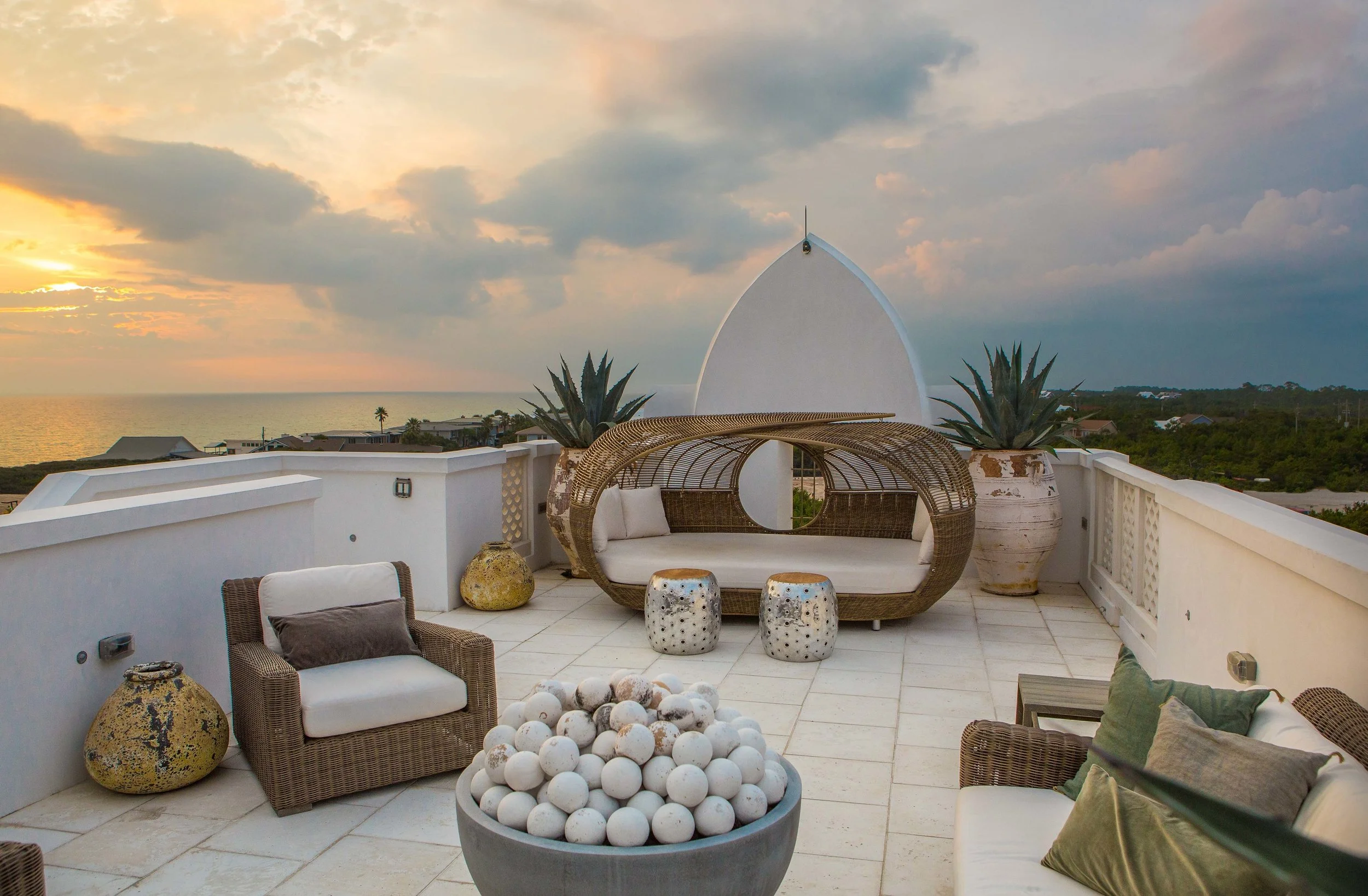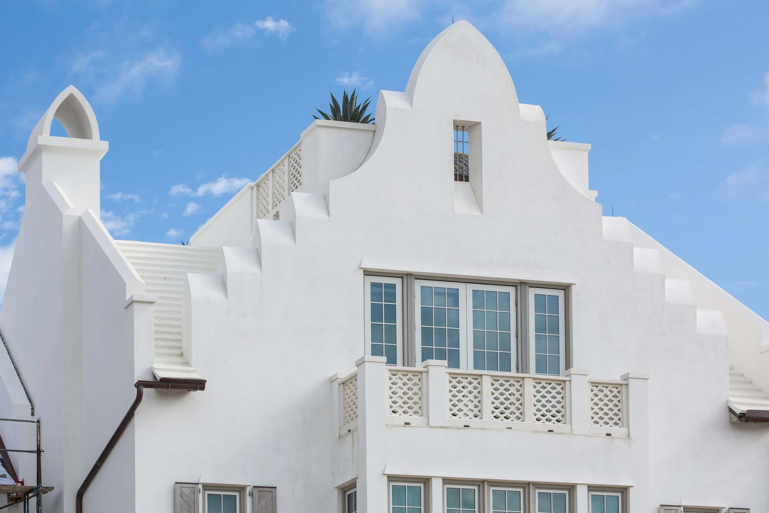 his home faces the Turtle Bale pedestrian path in Alys Beach and draws inspiration from classic Cape Dutch architecture. A sculptural parapet design defines the exterior, while the offset path allows for a dramatic corner entry with a curved opening and a niche sized precisely for a Bevolo gas lantern.T