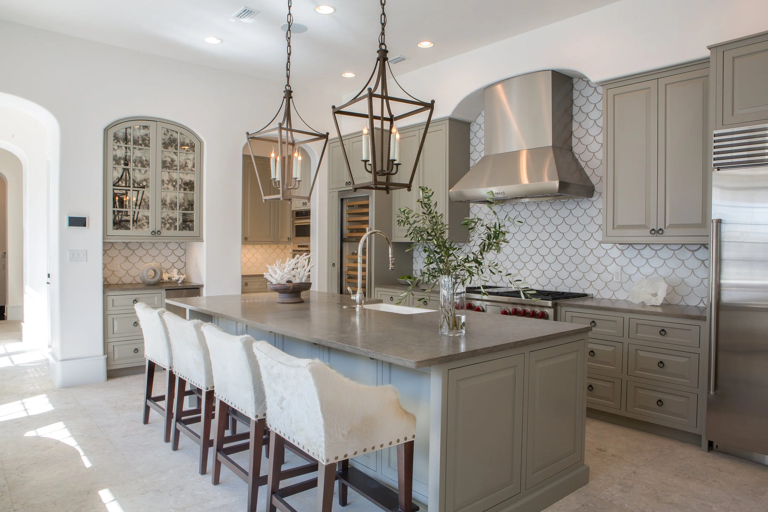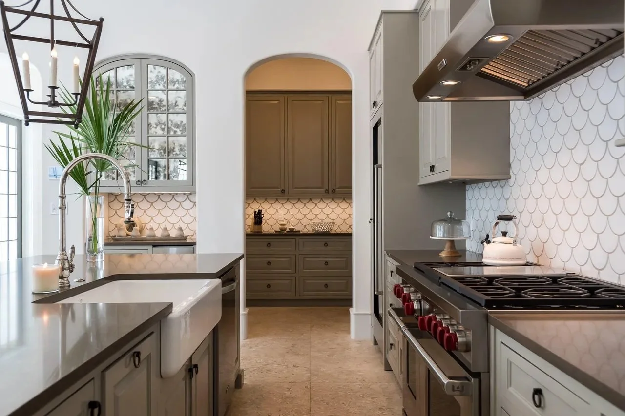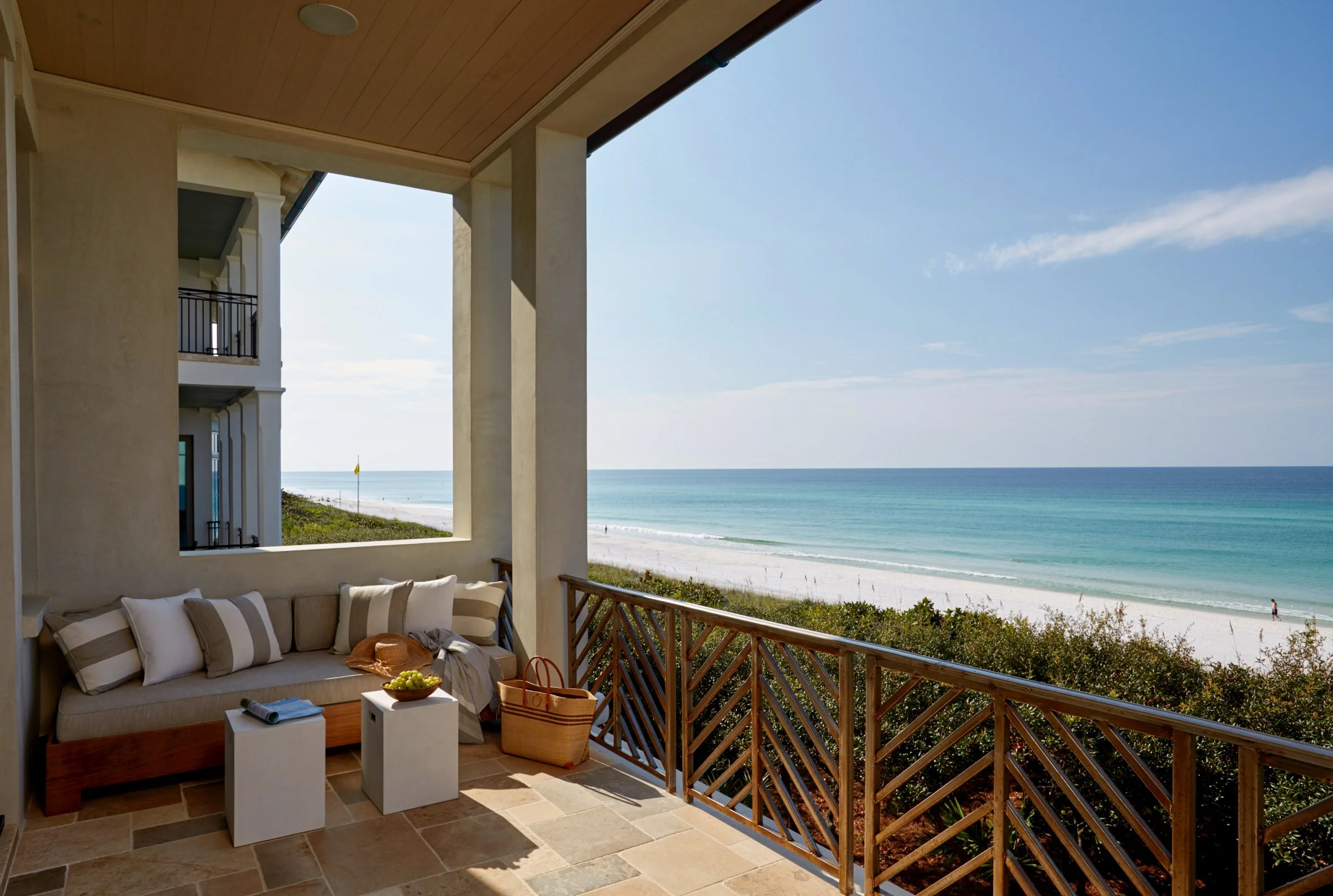 Entry into the home is through a breezeway with a sculptural opening, highlighted by an oversized Bevolo gas lantern and a feature window above that enhances the arrival sequence. The home is organized around a cozy central courtyard, creating a sense of privacy and calm. A sunny breakfast nook with banquette seating and a Moroccan-inspired pendant anchors one corner of the kitchen, which features a restrained color palette, generous island, bar area, butler’s pantry, and a full-height wine column—blending classic elegance with modern livability. Courtyards, balconies, and a roof terrace extend the living spaces outdoors year-round, with the roof terrace offering shaded seating beneath an arbor, an outdoor fireplace, and Gulf views that terminate the vista down South Charles Street.