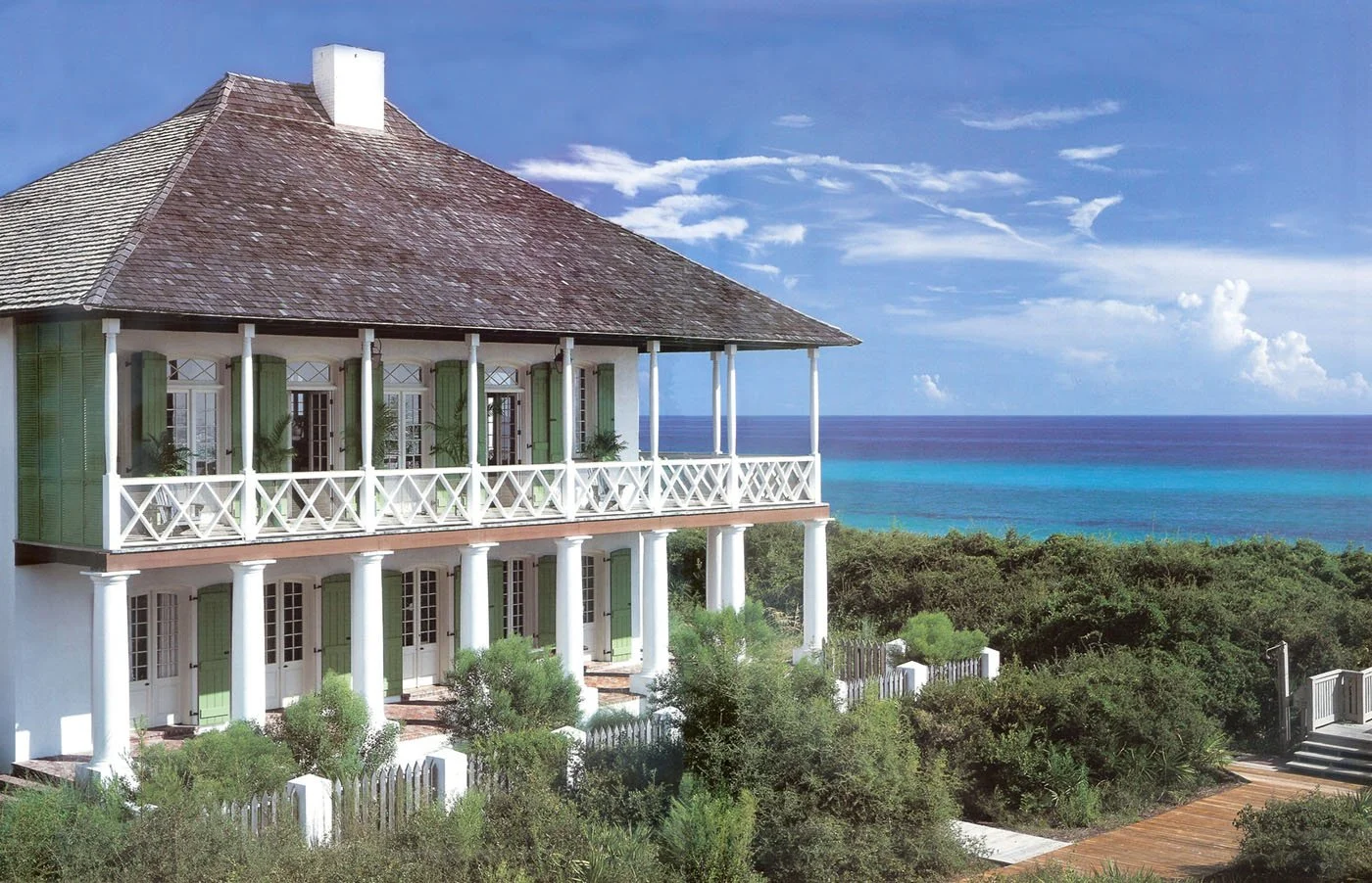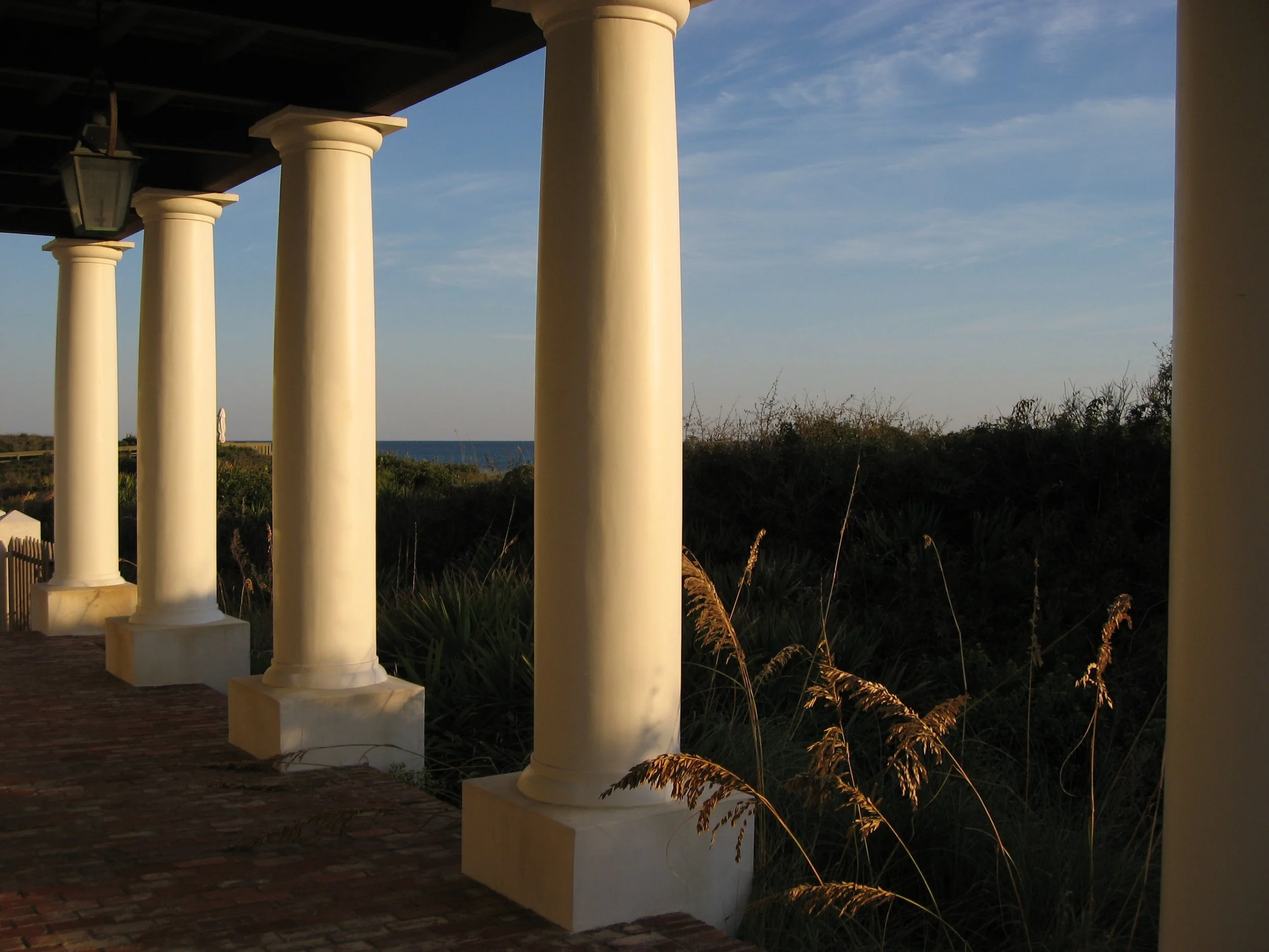 rawing from the historic Pitot House on Bayou St. John in New Orleans, this Gulf-front home in Rosemary Beach balances classical precedent with modern livability.DThe exterior was meticulously crafted to align with Historic American Buildings Survey (HABS) drawings, including custom-milled doors and windows and custom-poured concrete columns formed to match the precise entasis of the original stone columns. Inside, the home balances historical character with contemporary comfort.